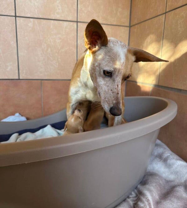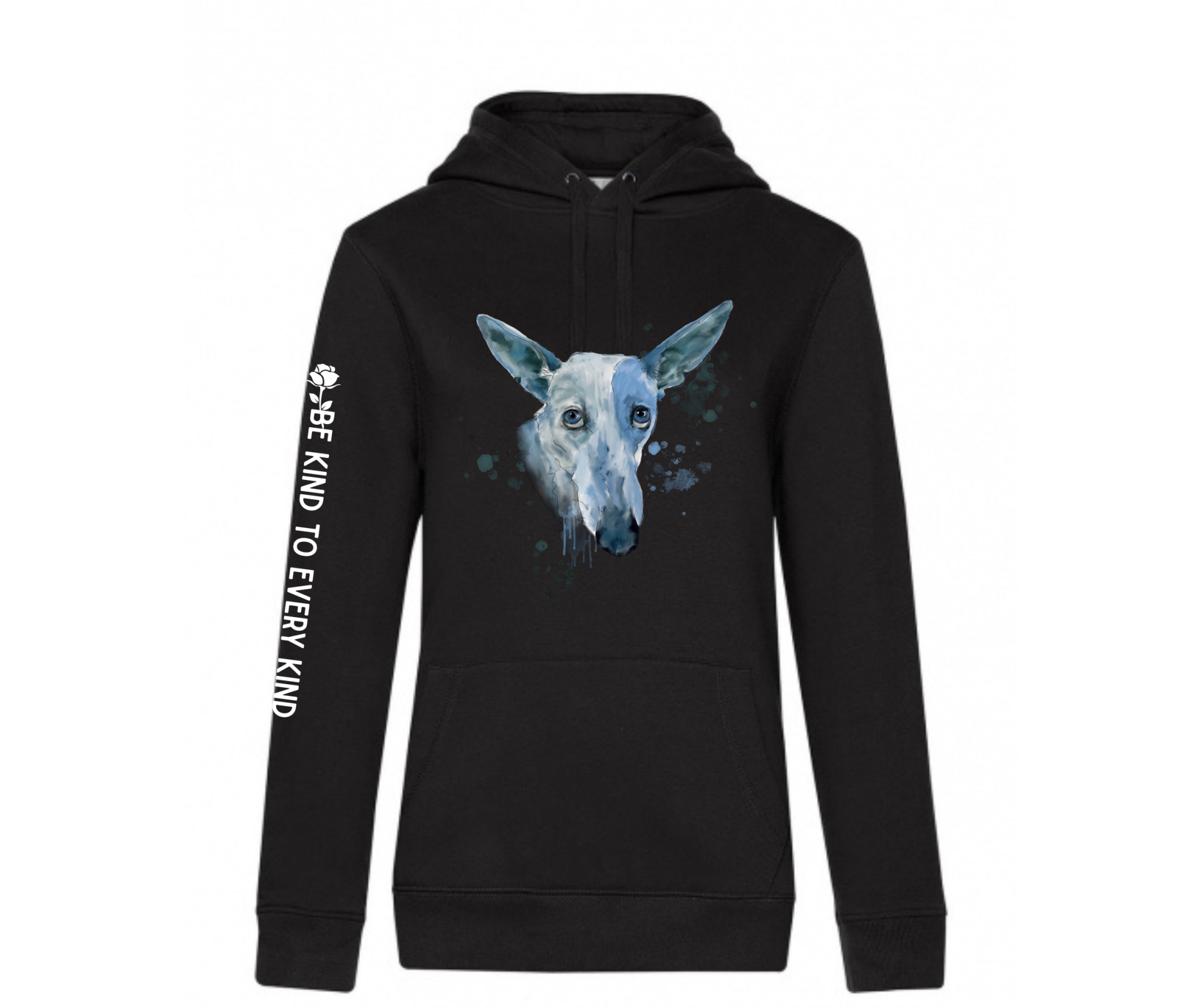 Deze hoodie in de kleur zwart is speciaal ontworpen om Kaneeltje (Cinnamon) te kunnen helpen. Ze is bevallen in een shelter in Spanje waar ze momenteel verblijft met haar zeven puppies. De unieke tekening van haar staat op het voorpand en op de rechter mouw ' Be kind to every kind'.
